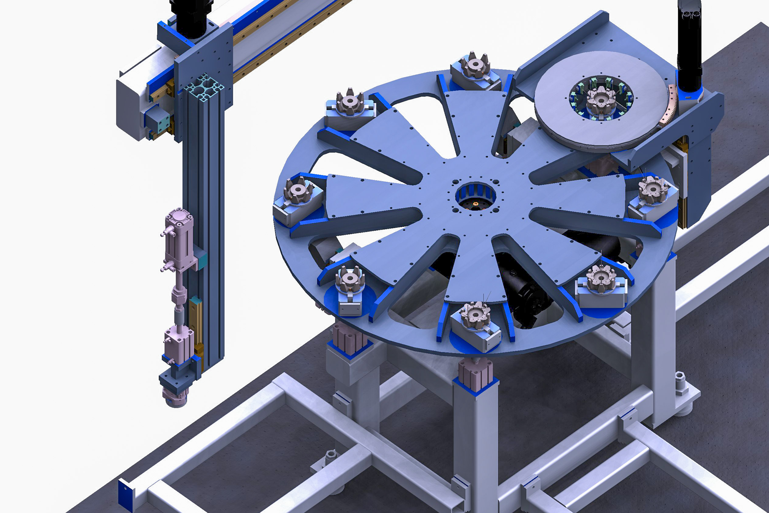 L'assemblage des aimants et de la bobine est réalisé sur un plateau rotatif de haute précision. Le process inclut la dépose automatisée des aimants par barillets, le contrôle de présence des laminettes et la mise en place de la bobine avec un outillage de maintien spécifique monté sur axe numérique. Pour garantir une polyvalence maximale, les doigts d'indexage des posages sont réglés automatiquement par servomoteurs lors des changements de série.