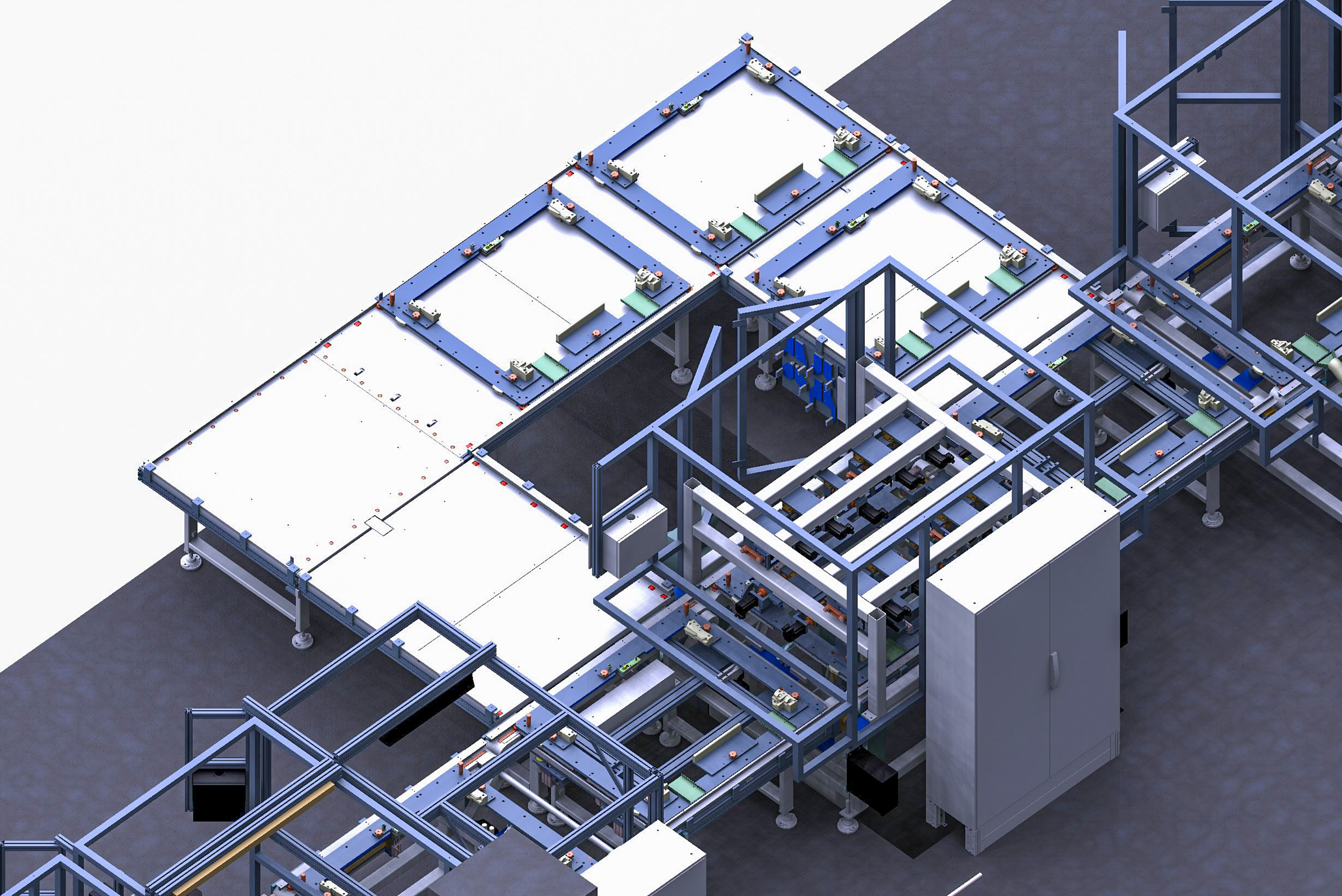 La ligne est conçue pour assembler plusieurs variantes de produits de grandes dimensions, avec des palettes dédiées et des posages interchangeables assurant flexibilité et répétabilité.