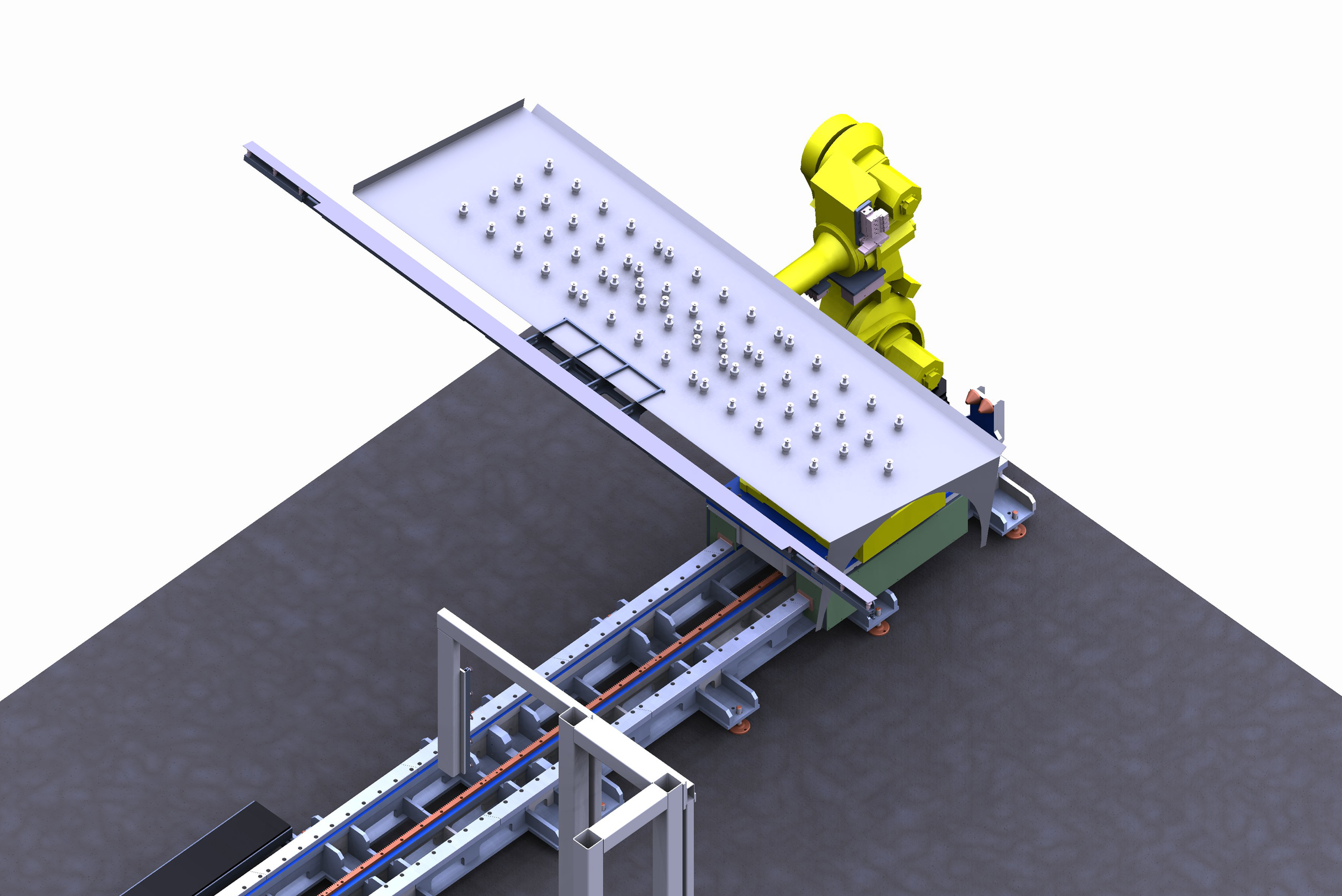 Le robot est installé sur un chariot motorisé numérisé, lui permettant de desservir plusieurs palettes de chargement, la presse plieuse et les postes annexes.